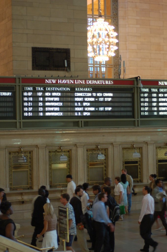 New Haven Line Departure Board @ Grand Central Terminal showing the special US OPEN trains to Mamaroneck. Photo taken by Brian Weinberg, 6/16/2006.
