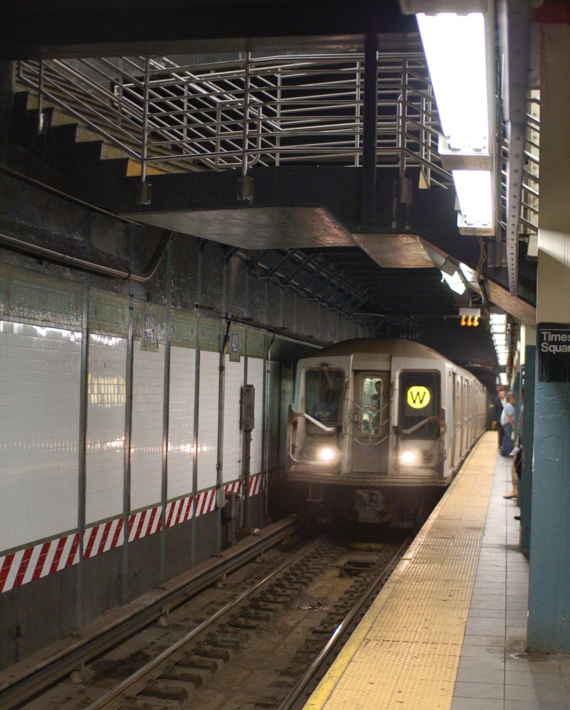 R-40 4285 @ Times Square - 42 St (W) - southbound platform, with the new staircase overhead.