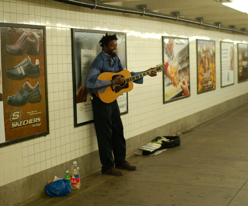 Musician @ 14 St corridor connecting 14 St (1/2/3) and 14 St (F/V) / 6 Av (L). Photo taken by Brian Weinberg, 8/4/2006.