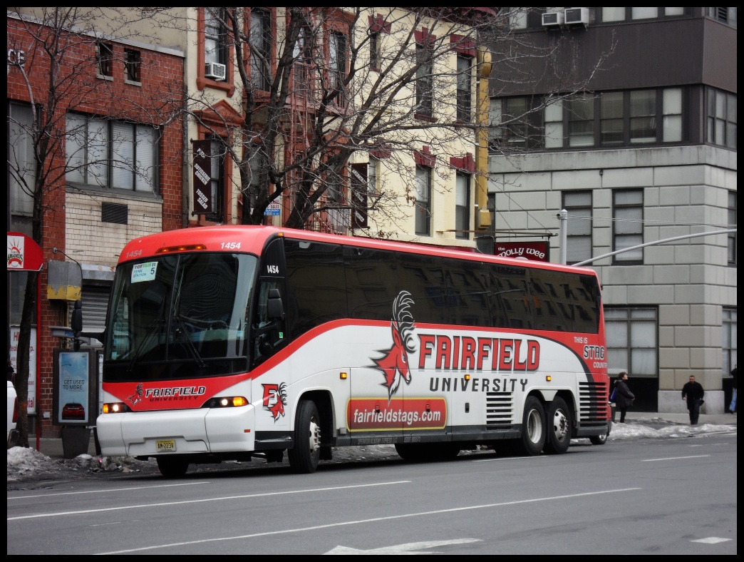 Academy MCI bus 1454 @ Penn Station New York. Taken 2/14/2011. Note the Fairfield University (CT) paint scheme. - Academy MCI bus 1454 @ Penn Station New York. Taken 2/14/2011. Note the Fairfield University (CT) paint scheme.