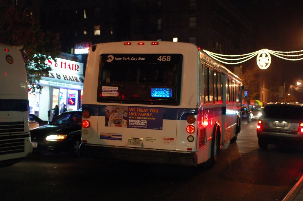 MTA NYCT "New York City Bus" Orion V 468 @ 231 St (Bx10). Note messed up rear sign. And the side sign was completely off. Photo taken by Brian Weinberg, 11/21/2007.