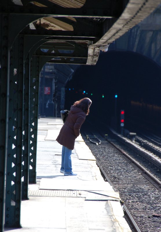 Dyckman St (1). Woman looking into tunnel for oncoming train. Photo taken by Brian Weinberg, 3/2/2008.
