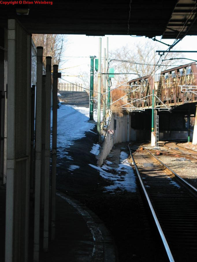 Newark City Subway Norfolk Street station. Note the abandoned trolley ramps to the left and right of the NCS tracks. Photo taken by Brian Weinberg, 2/16/2004.