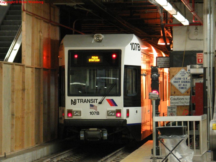 NJT NCS LRV 107B @ inbound platform at Newark Penn Station. Photo taken by Brian Weinberg, 2/16/2004.