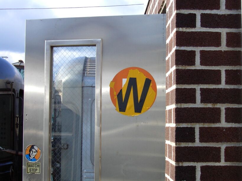 Door to the little brick building at the North/East end of the platform. Photo by Brian Weinberg, 11/27/2002. (81k)