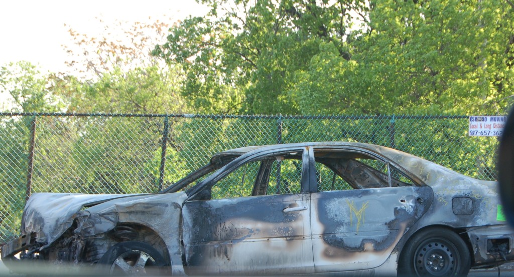 Bombed out Toyota Camry - crashed and burned on I-87 on Friday night - photo taken by Tamar Weinberg on Sunday morning. - Bombed out Toyota Camry - crashed and burned on I-87 on Friday night - photo taken by Tamar Weinberg on Sunday morning.