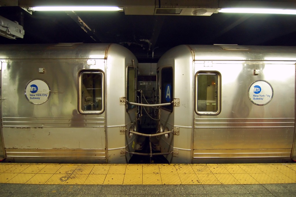 R-44 5434 and 5228 @ 207 St (A). Note the comparison of the car on the left with the painted carbon steel belly band and the car on the right with the stainless steel belly band. - R-44 5434 and 5228 @ 207 St (A). Note the comparison of the car on the left with the painted carbon steel belly band and the car on the right with the stainless steel belly band.