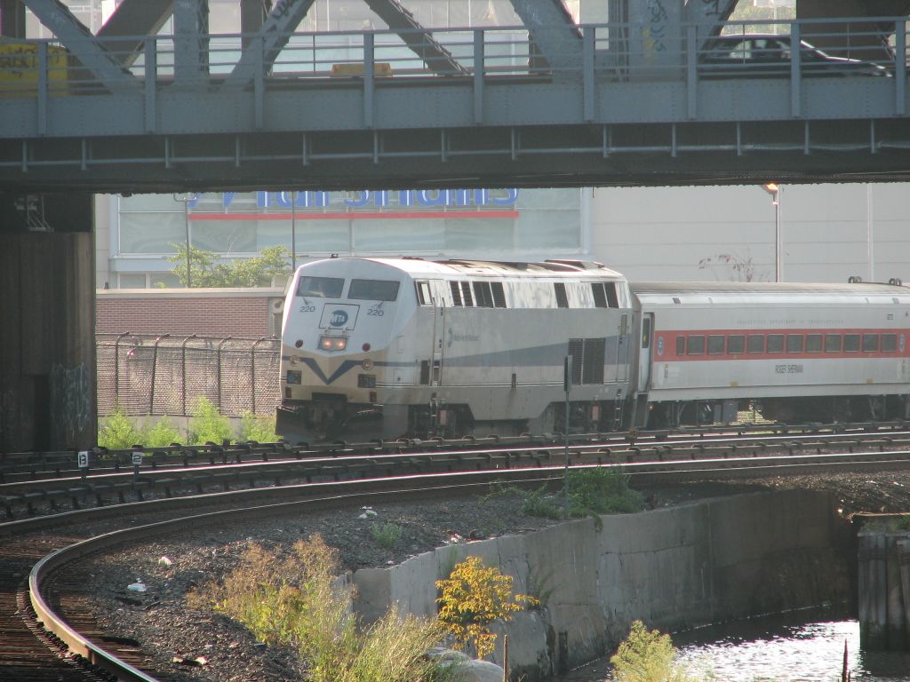 MNCR P32AC-DM 220 and Shoreliner coach "Roger Sherman" @ Marble Hill (MNCR Hudson Line). Photo taken by Brian Weinberg, 8/17/2005.