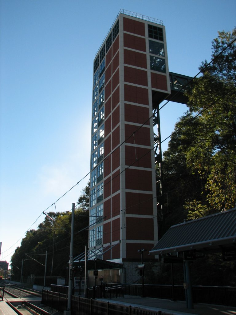 NJT HBLR Ninth Street - Congress Street station at track level. Elevator goes up to the top of the palisades. Photo taken by Brian Weinberg, 10/30/2005.