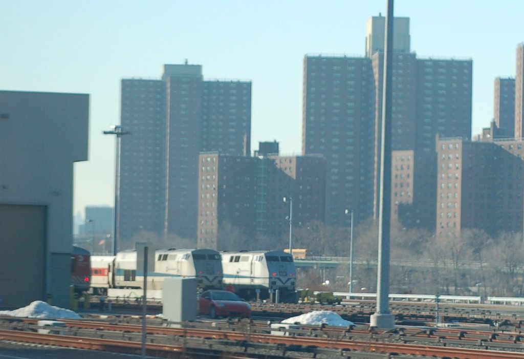 MNCR P32AC-DM locomotive sets and an M-2/4/6 set laid up @ Highbridge Yard while hundreds of people wait in the Bronx for trains
