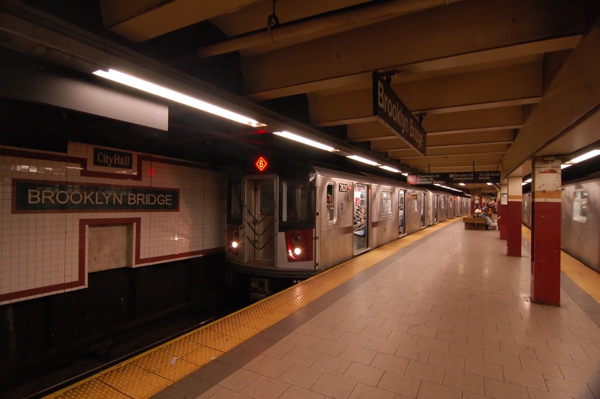 R-142A 7631 @ Brooklyn Bridge (6) - front of the northbound platform (looking south). Photo taken by Brian Weinberg, 6/28/2006. - R-142A 7631 @ Brooklyn Bridge (6) - front of the northbound platform (looking south). Photo taken by Brian Weinberg, 6/28/2006.