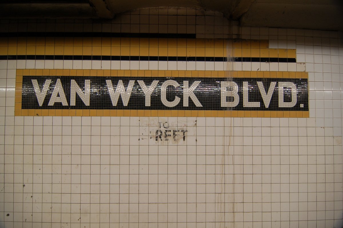 Briarwood - Van Wyck Blvd (E/F) - name tablet toward the middle of the Manhattan-bound platform. Photo taken by Brian Weinberg,