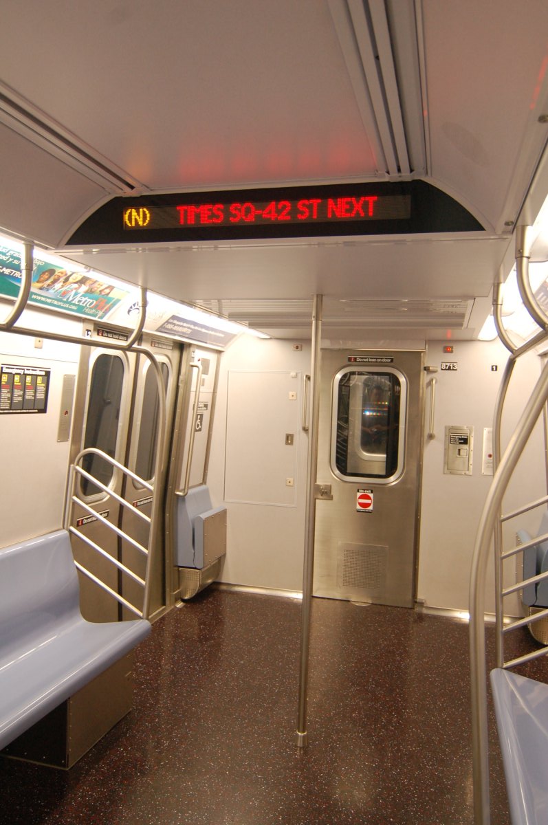 R-160B 8713 @ 57 St - 7 Av (N) - interior. Note: first revenue run of the R-160 fleet as part of the 30-day test. Photo taken by