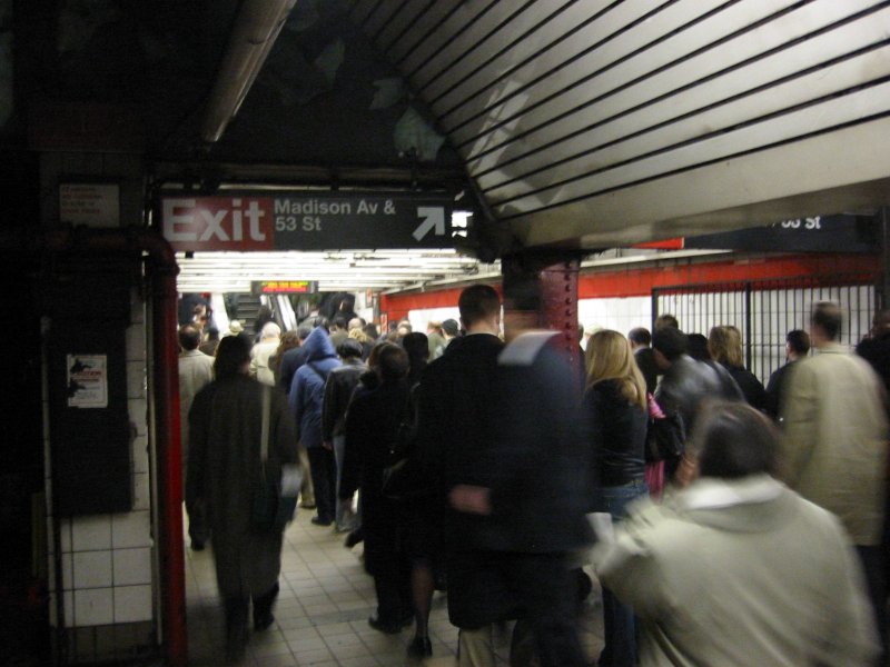 Geese on the upper (westbound/southbound) level of 5 Av / 53 St heading towards the escalators up to the mezzanine. Photos taken by Brian Weinberg, 4/1/2005.