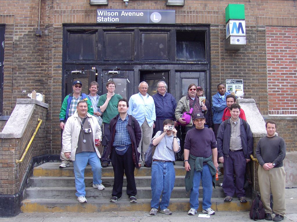 Peggy Darlington's Eastern Division Tour. Photo taken by Brian Weinberg, 4/27/2003. SUBWAYMAN, VictorM, Wayne-MrSlantR40, Peggy, Dante, GP38/R42 Chris, David Gerber, David of Broadway, Nick, #7 Flushing, R40slantontheB. - Peggy Darlington's Eastern Division Tour. Photo taken by Brian Weinberg, 4/27/2003. Shown, left to right, back row: 3rd = SUBWAYMAN, 5th = VictorM, 6th = Wayne-MrSlantR40, 7th = Peggy, 8th = Dante, 9th = GP38/R42 Chris; front row: 2nd = David Gerber, 3rd = David of Broadway, 4th = Nick, 5th = #7 Flushing, 6th = R40slantontheB.
