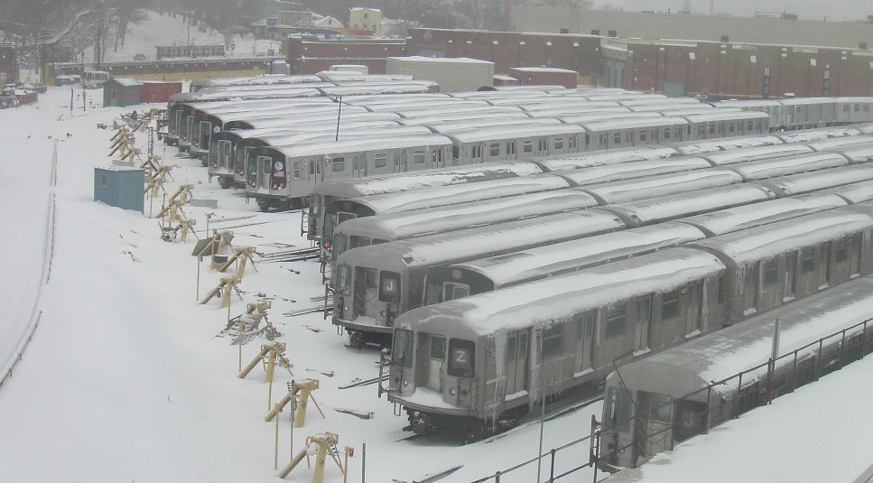 R-40M, R-42, and R-143 cars @ East New York Yard. Photo taken by Brian Weinberg, 02/17/2003. This was the Presidents Day Blizzard of 2003.