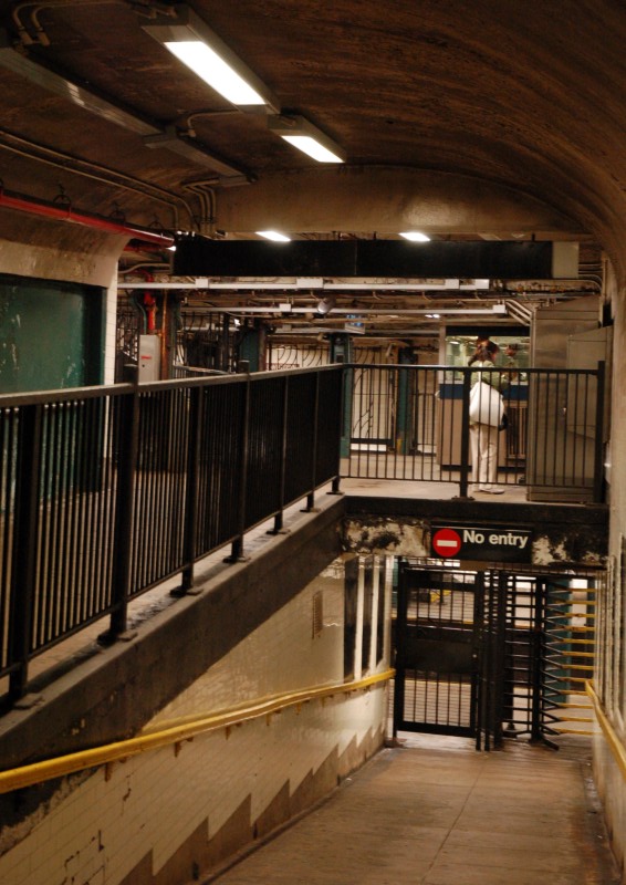 190 St (A). Entrance @ Bennett Ave & W 193 St. Looking west at fare control on upper level and platforms on lower level. - 190 St (A). Entrance @ Bennett Ave & W 193 St. Looking west at fare control on upper level and platforms on lower level.