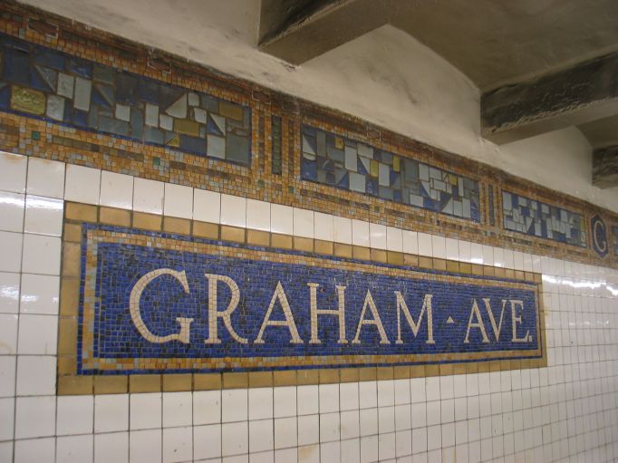 Wall tiles @ Graham Ave (L), front of Canarsie-bound platform. Photo taken by Brian Weinberg, 3/10/2004.