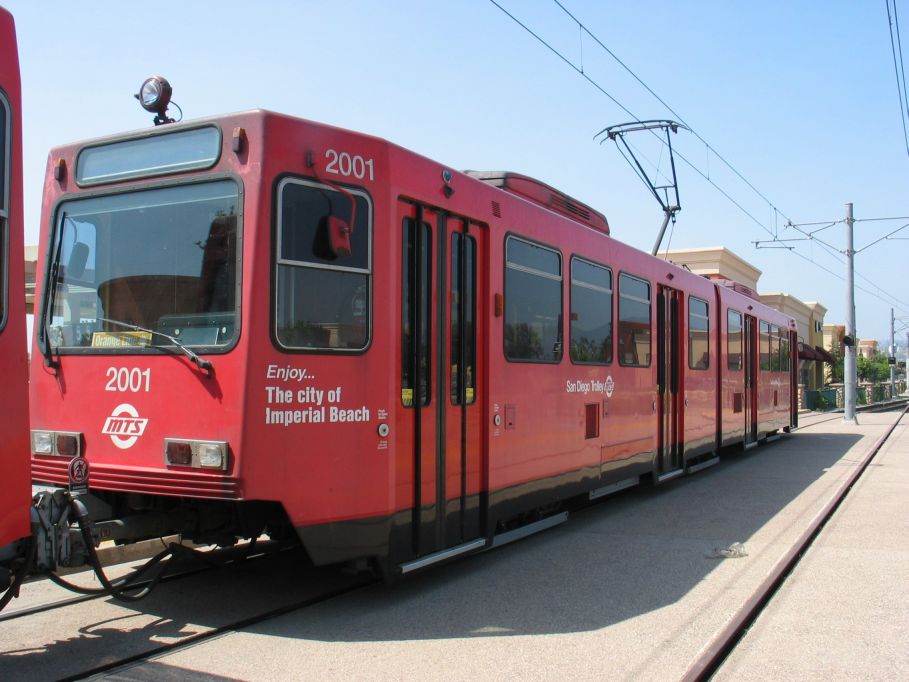 San Diego Trolley Siemens-Duwag LRV #2001 @ Santee Town Center. Photo taken by Brian Weinberg, 6/6/2004.