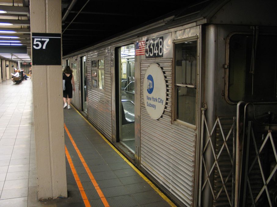 R-32 3348 @ 57 St (Q). Note one of its two odd style number boards. Photo taken by Brian Weinberg, 6/23/2004.